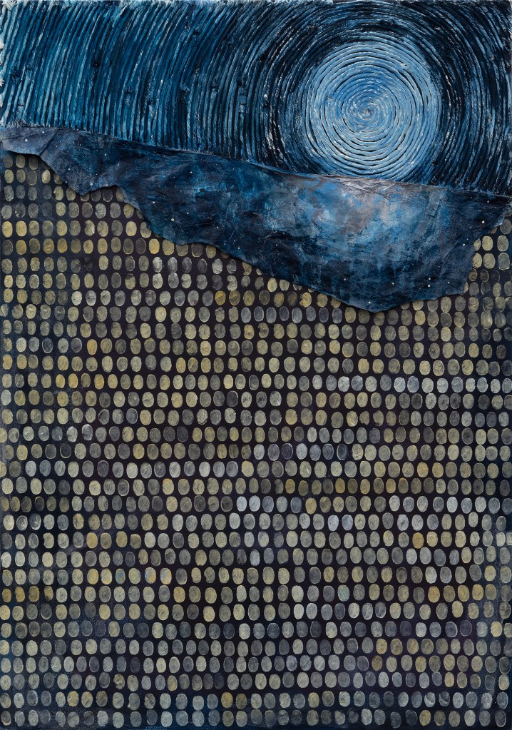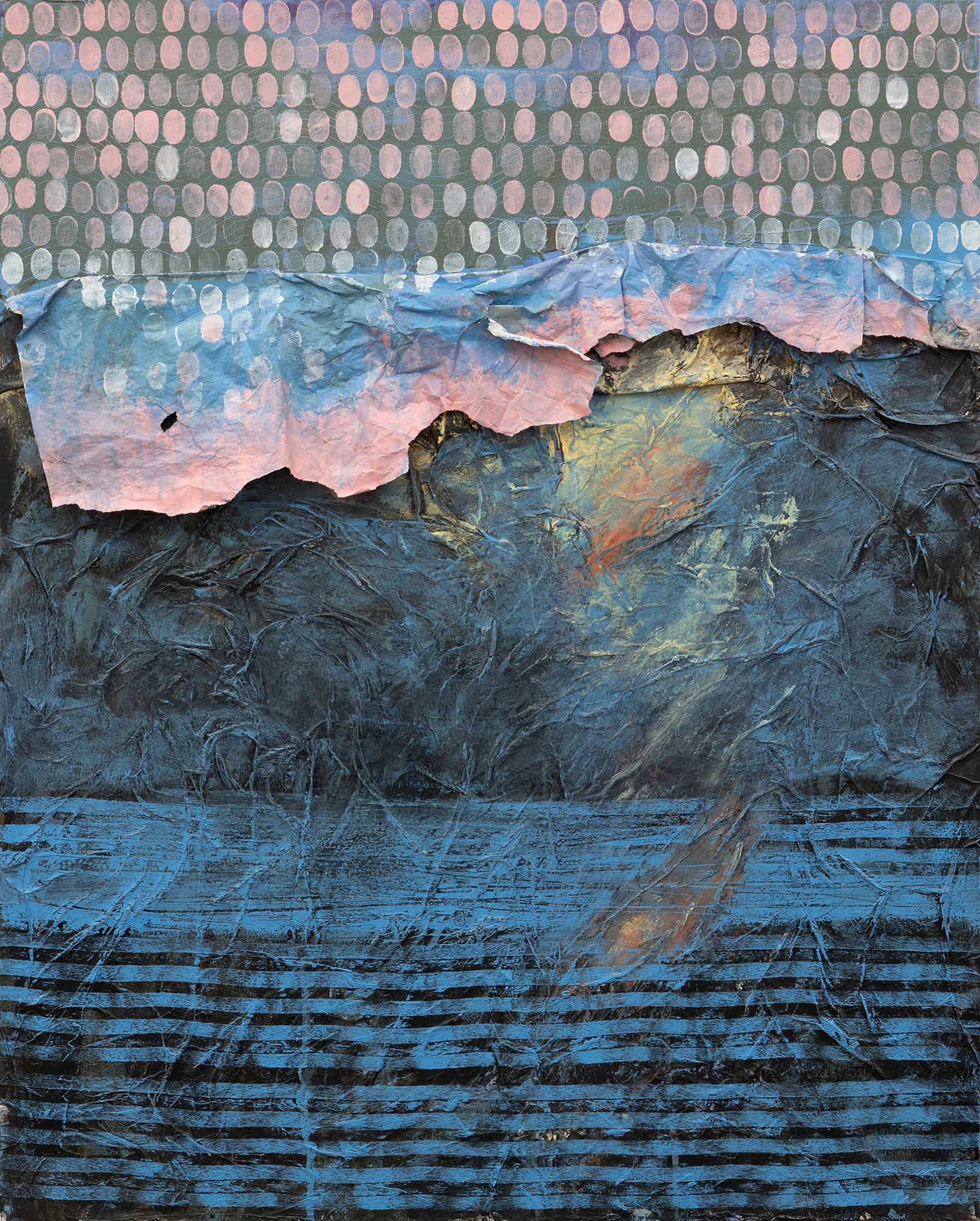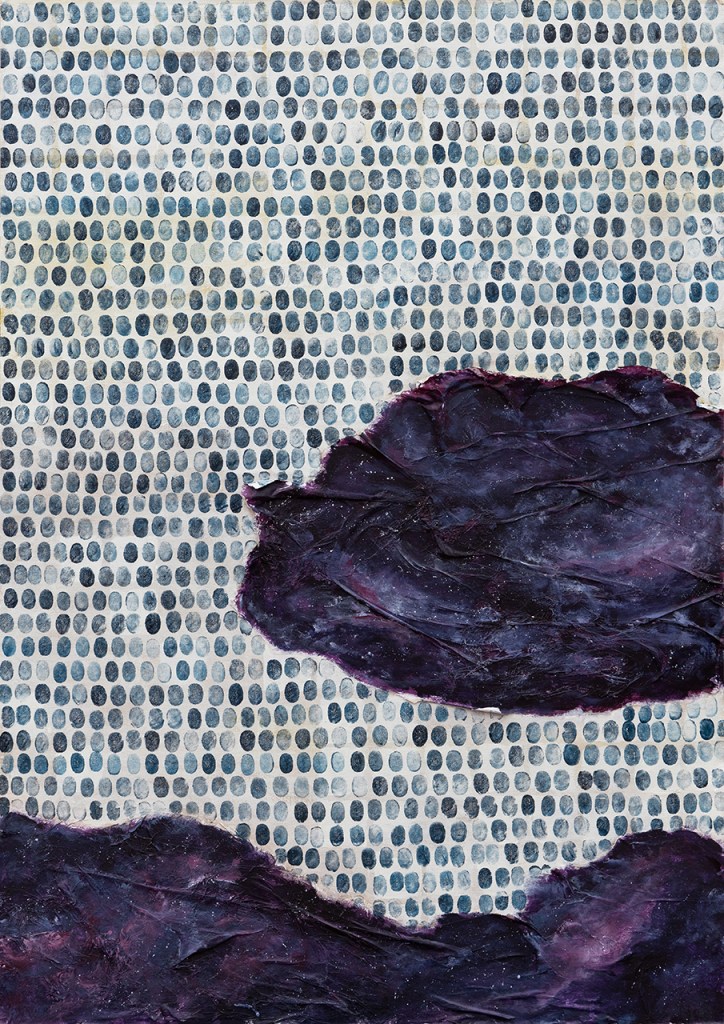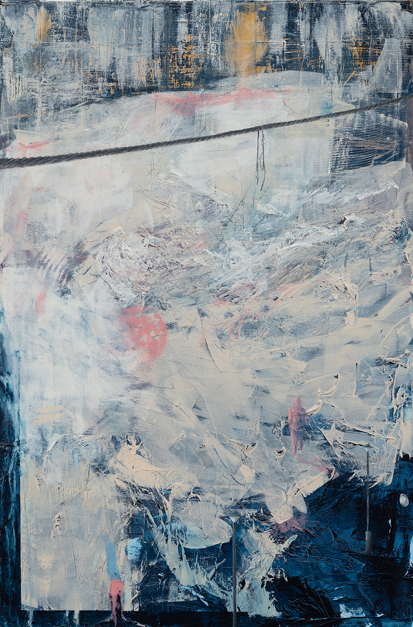 7 piętro. Akryl, akwarela, sznurek i papier na płótnie, 100x70cm